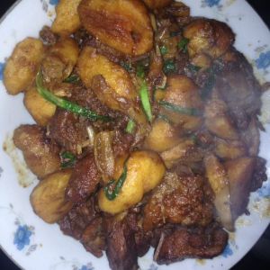 把处理好的茨菰倒入,再炒一炒,然后倒入一瓶啤酒,盖上锅盖,小火煮至鹅肉酥烂