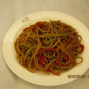 锅中留少许底油,煸香蒜片和黑椒碎,加入青红椒丝、洋葱丝,炒香后加入意面和牛肉丝,加老抽和生抽调色和调味,尝一下,口感清淡的话,再加点盐炒一下即可装盘。