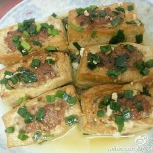 豆腐切小块,我买的的是两块大的豆腐,一块切成三份,五花肉可以自己剁成馅也可以叫卖肉的人绞碎,调好味备用。葱花切成细段。