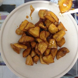 把锅放入少量水,也就多半勺子吧,然后放糖,中火熬到发黄起泡,倒入地瓜,翻炒两下出锅
