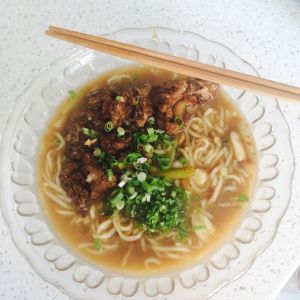 煮面的过程忘记照了 就是大约一个小时以后 把排骨捞出 在盛大约一小碗的排骨汤 后续备用 再将一大碗凉白开再倒进锅里 继续煮汤 沸腾时 下面条煮 煮熟之后 面条捞出 把锅里的汤浇上去