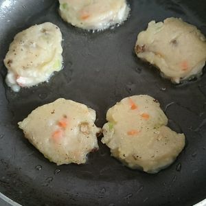 将各种蔬菜丁和面粉放入土豆泥中,进行搅拌,最后再加入少许盐(盐一定不要太多,我就是盐略多,最后出来的比较咸),把所有东西搅拌均匀后包上保鲜膜,省个十分钟左右。