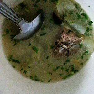 放高压锅里面!用焯排骨去浮沫的水。不够的话继续加。我用的普通高压锅,电高压锅的话没有这个弄出来好喝!大火喷15分钟。等放气,小火煮20分钟~可以放点香菇。这次我放的冬瓜~