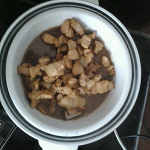 锅里倒油,放入五花肉,翻炒至微微变色,加入料酒(料酒要盖过肉)。
