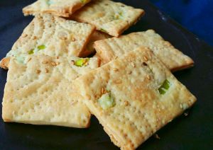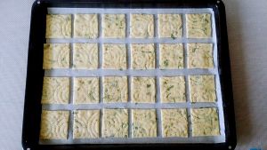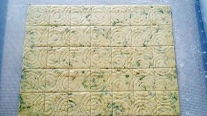 最后将面块擀成约2mm厚的大片,撒上余下的另一半芝麻擀一下,用叉子在面片上扎一些小孔,切成方形或用切模切成任意想要的形状。