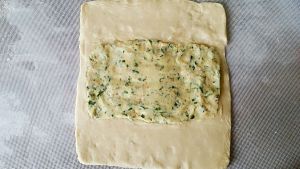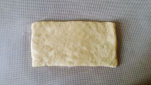 将擀开的面团两端朝中间折过来,再对折,再擀开,像叠被子一样重复两次。