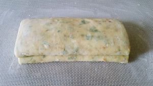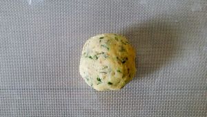 接着制作油酥面团。黄油隔水融化后将黄油、盐、淀粉、切细的葱末、一半的熟芝麻混合,揉成油酥面团。