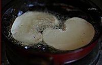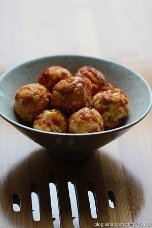 鸡蛋煮熟去壳 用刀在蛋白划几刀 入油锅炸过待用