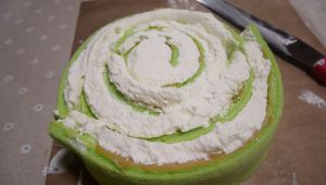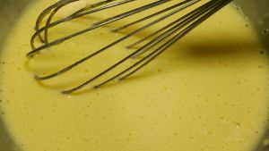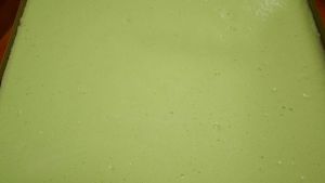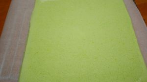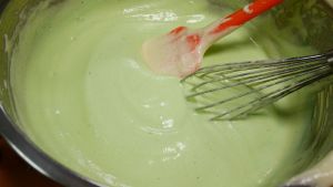3分之1蛋白加入蛋黄糊加入斑兰精3滴切拌,翻拌均匀。倒入全部蛋白切拌均匀