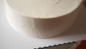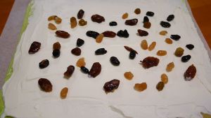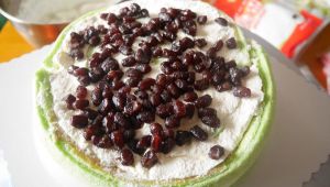 在蛋糕片上涂上250克奶油撒上蜜豆