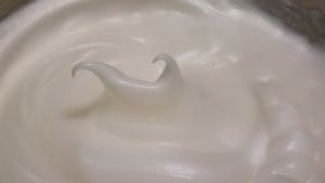 蛋白加入二滴柠檬汁打到粗泡后加入一克盐,打至有小泡时加入二分之一糖,打至蛋白比较细腻时加入第二次糖,打至蛋白有小弯钩就可以