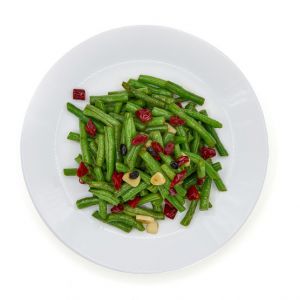 锅中留油30克,烧热,放入干椒段、蒜、肉末炒一下,倒入炒好的豆角,用小火炒1.5分钟,依据个人口味加入小炒料包,炒均匀即可。
