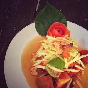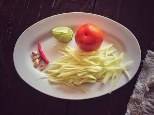 稍微捣碎搅拌后,放入青木瓜丝和花生碎继续搅拌,