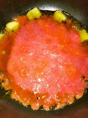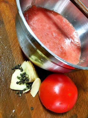 番茄留一个小的,其他全部打成番茄汁,生姜切片,没有料理机的就切碎一些