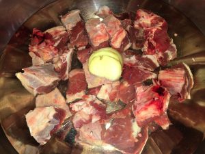 将牛腩切麻将大小肉块儿,给姜片,料酒,煮沸撇去泡沫,控干备用