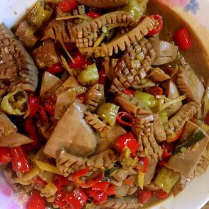 第一步:小主不太会处理整个的腰花,所以在买的时候就让老板帮忙把腰花处理好,切花块。拿回来清水洗净,放入容器中备用。
