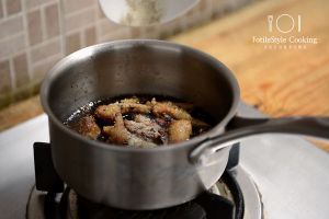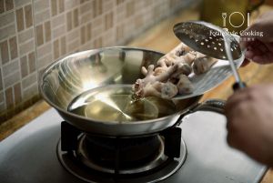 锅中放入适量热水,大火烧沸后将鸡爪放入汆煮5分钟,再取出沥干充分擦干水分。