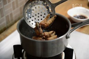 中火烧热锅中的油,待烧至八成热时将鸡爪放入,炸至表皮颜色金黄(约需3分钟),捞出沥干油分待用。