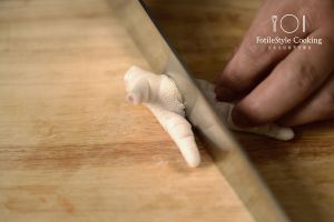 将鸡爪清洗干净,剁去爪尖指甲,再从中间劈成两半。豆腐泡对半切开。