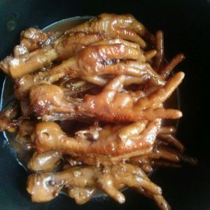 糖色炒好后放入鸡爪翻炒均匀,一次放入八角,花椒,香叶,炖肉包,蚝油,生抽,老抽,葱段,姜汁翻炒均匀。