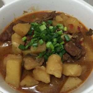 大火收汁盛出后撒上葱花,一道美味的土豆烧排骨就完成啦!