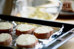 烤盘垫铝箔,面包片均匀平放在铝箔上