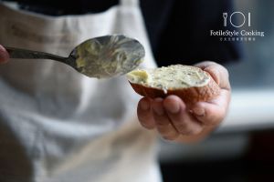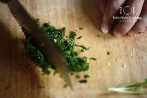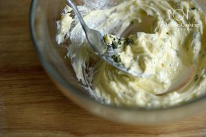 剩余大蒜加盐捣碎,黄油室温融化,将欧芹和蒜泥放入融化的黄油,搅拌均匀。