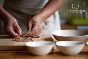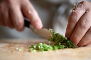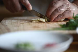 大蒜(取一半)、姜切碎,小米椒留一个切圈,其余切碎