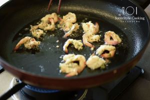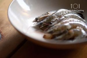 大虾放入沙拉碗中,加入酱汁拌匀,盖上保鲜膜腌制15 分钟。