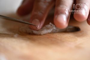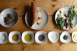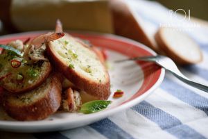 大虾100克,蒜瓣4瓣,姜10克,葱10克,芝麻菜20克,小米辣椒10克,鲜罗勒叶20克,法棍半条,柠檬汁5ml,芝麻油10ml,橄榄油10ml,盐6克,黑胡椒粉3克,黄油55克,欧芹碎2克