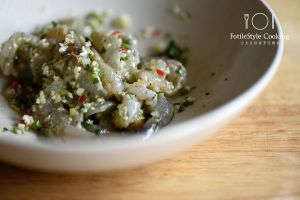 与大蒜末、姜末、辣椒碎、罗勒叶、柠檬汁、芝麻油、橄榄油、盐和黑胡椒粉混合成汁水