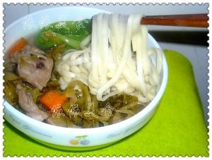 把煮熟的酸菜排骨加进去,一碗酸菜排骨面就好了: