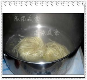 另外取一锅,水开后放进面条煮5分钟,加一点油、盐,放生菜进去焯至生菜变绿色: