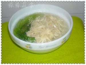 放一点点鸡精调味,把面条、生菜捞起装碗,倒进一点煮面的汤: