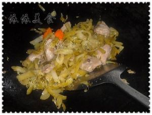 加入胡萝卜片、酸菜爆炒2分钟,加入没过材料1/3的清水焖煮5分钟,放点白糖、放点盐调味;