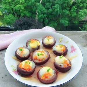香菇伞里放少许胡萝卜粒,上蒸锅,大火蒸15分钟,小火蒸3分钟