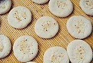 将紫薯泥放入按扁的面皮中,像包包子一样包好,再用手轻轻地将它按扁,撒少许白芝麻,醒十分钟。