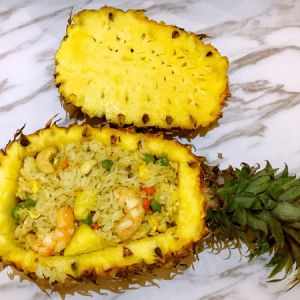 准备好所有食材,胡萝卜切小丁,洋葱切碎,玉米豌豆焯水,鸡蛋打散,大虾煮熟菠萝切丁
