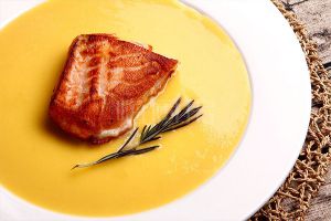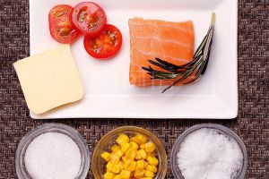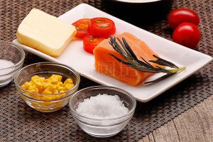 在锅内加入少量色拉油和一半黄油,烧热后将三文鱼放在锅中用大火四面煎至金黄起脆后取出,将锅刷干净后,加入打好的玉米汁,加入少量清水,黄油、盐和糖调味后收浓汁,将汁浇在煎好的鱼身上,撒入圣女果即可。