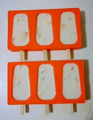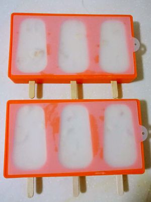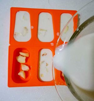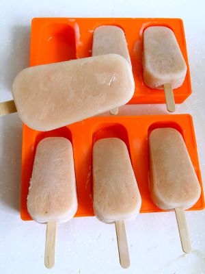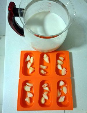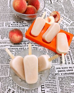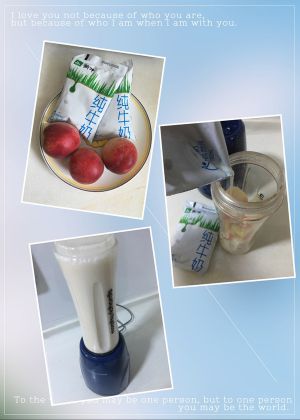将桃子洗干净去皮,去核切块和牛奶、糖混合打成果汁。