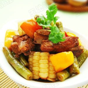 胡萝卜切块,豆角去筋掰成小段,玉米切段备用;葱切段、姜切片、花椒、八角、豆瓣酱备用;