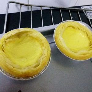 加入炼乳搅拌好用筛子过滤倒入蛋挞皮里,放上几个葡萄干烤箱180°预热5分钟,10升烤箱180-190°中层烤15分钟