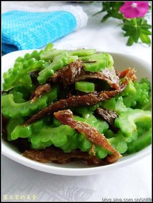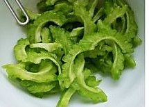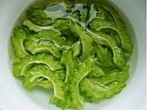 取出后将苦瓜放在冰水里冰一下,再拿出控干水分放在盘子里,这样吃起来更爽口。