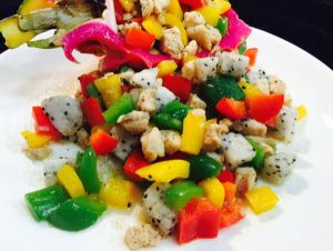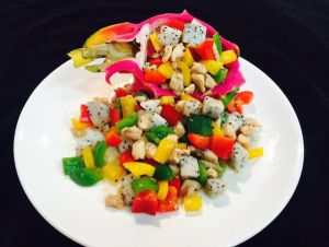 5.加入火龙果丁 翻炒两下 关火 出锅 火龙果皮摆拍哦 创意又美味