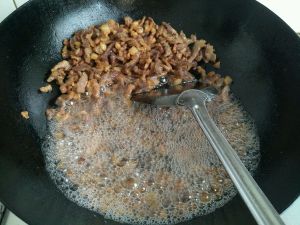 出油后放入瘦肉转中火继续煸至肉成金黄色即可,捞出备用(切记煸炒期间不放一滴油)