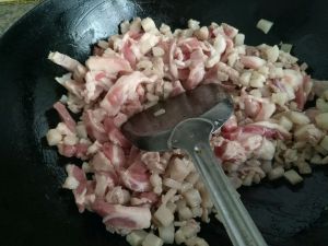干锅放入肥肉,小火煸至出油(一点油不放)