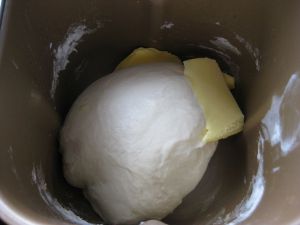 面包部分的材料揉光滑后加入42g黄油揉至扩展阶段。