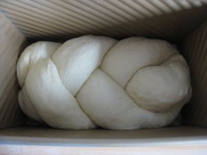 三份面团都卷好后像编辫子一样编在一起,两端压在下面,放入吐司盒中。