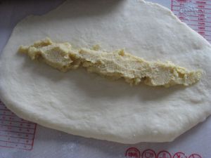 每一份都擀成一个近似长方形,长边大概20cm,在中间放入三分之一的内馅。