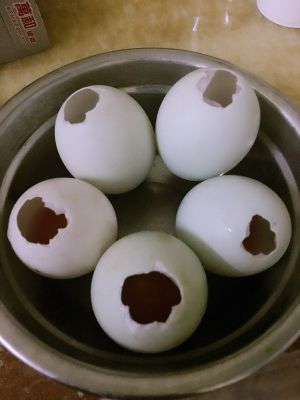 鸭蛋把尖头磕破倒出蛋白,只留蛋黄,孔约硬币大小
